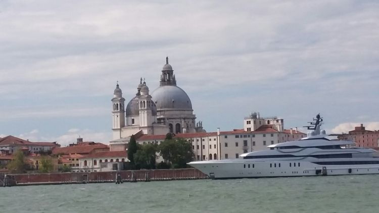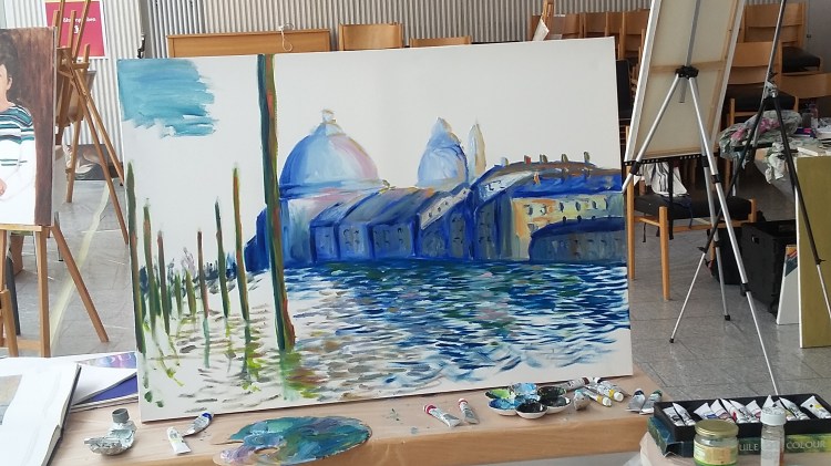 Die Reise nach Venedig hat mich inspiriert das wunderbare Licht- und Farbenspiel der Stadt auf dem Wasser in einem Werk festzuhalten. Dabei ließ ich mich von Monets Darstellung der Santa Maria della Salute Kirche inspirieren.