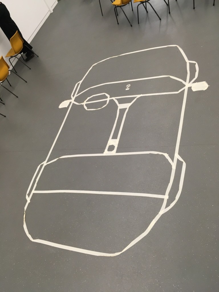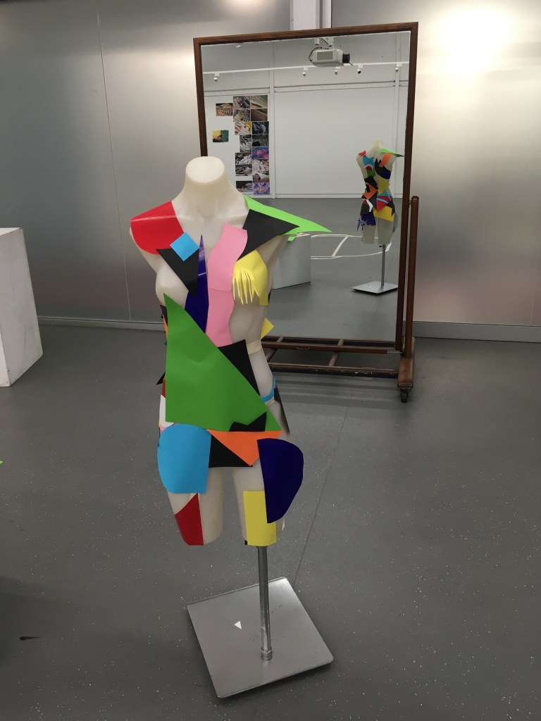 Mein Road Trip inspirierte mich im Contemporary Art Kurs von Christopher Fitzallen in einem Projekt zu Persönlichkeit und Raum umzusetzen. Eines der Projekte aus dieser Arbeit befasst sich mit dem transferieren von Räumen in andere Räume. Der Raum des Autos wurde in den Raum der Ausstellung transferiert und der Raum des Autos wurde mit bunter Pappe ausgelegt und dient als Schnittmuster für ein Kleid.